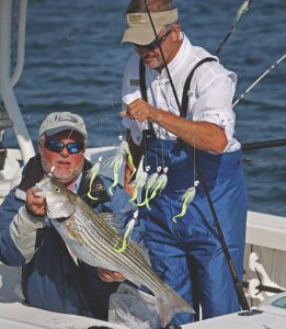 Trolled rigs imitating multiple baitfish can be too much for stripers to resist. (Photo by Ron Sinfelt)