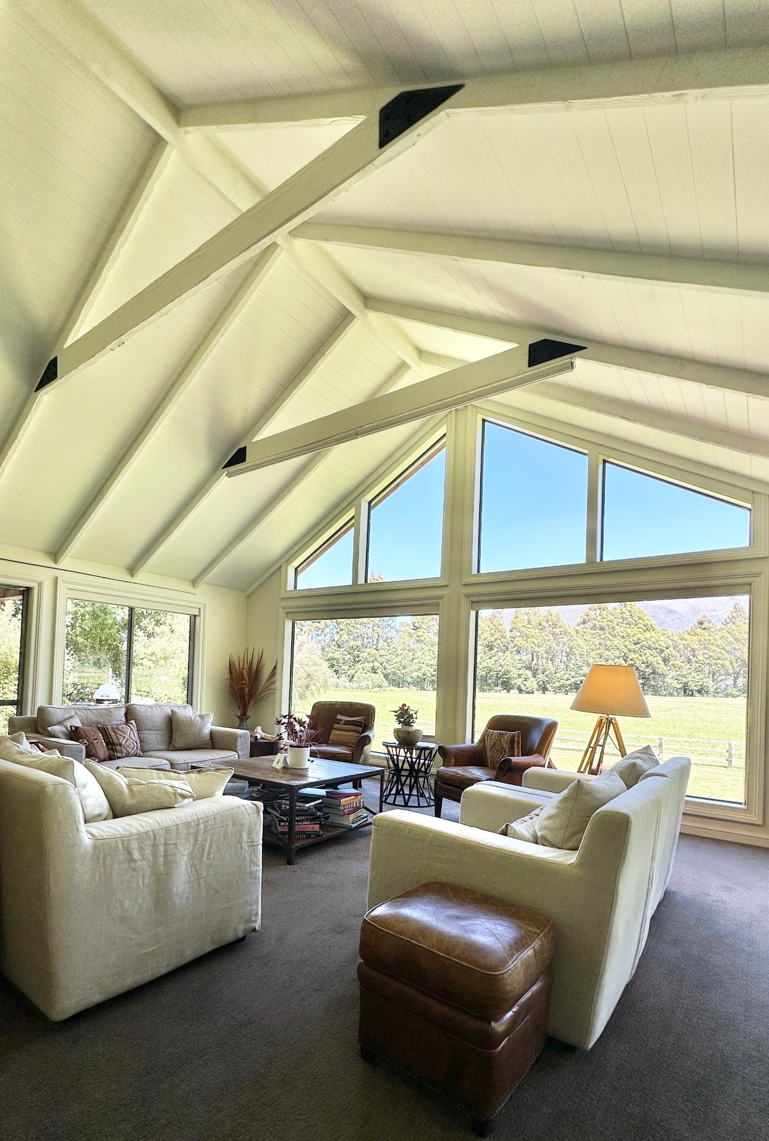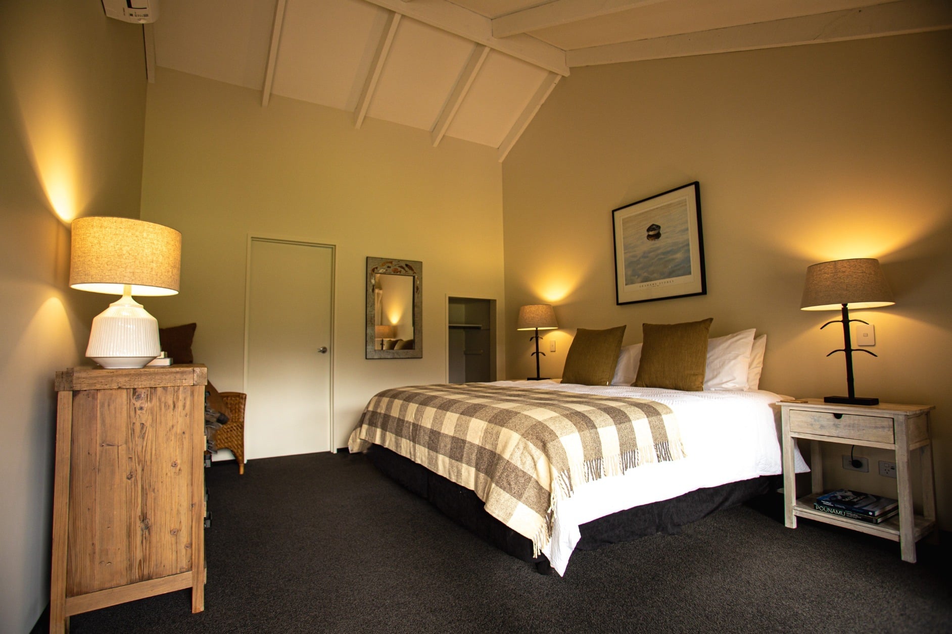The property offers just four elegantly appointed double-occupancy guest rooms, each featuring a spacious en-suite bathroom and ample room to unwind after a day in the field. Recently remodeled with comfort and sophistication in mind, the rooms are seamlessly connected to the main lodge and dining area by a sheltered breezeway. Expansive windows throughout the lodge capture uninterrupted views of the Southern Alps, ensuring the grandeur of the surroundings is always on display.