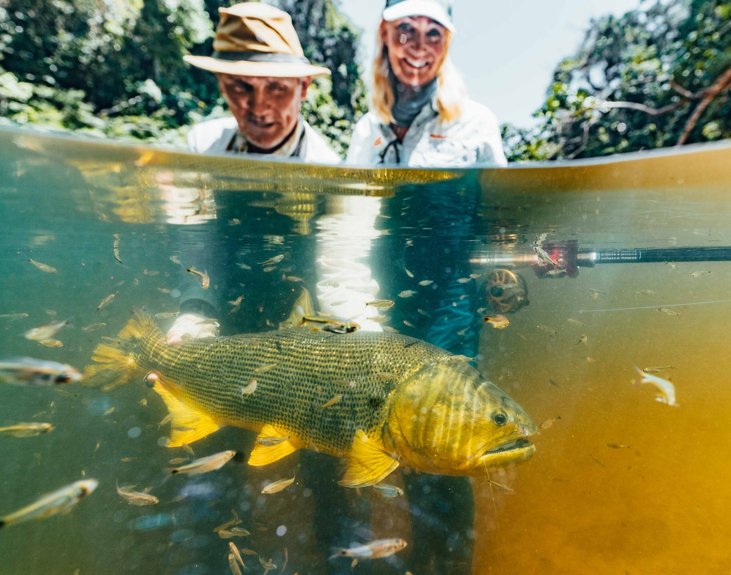 Fishing at this camp spans both upstream and downstream waters. Upstream, the river winds through dramatic scenery of moss-covered cliffs and deep green pools, offering outstanding dorado and pacu fishing, accessed via traditional pole-driven dugouts. Downstream, broader channels with scattered woody debris provide excellent wade- and boat-fishing for large dorado, navigated with motorized dugouts.