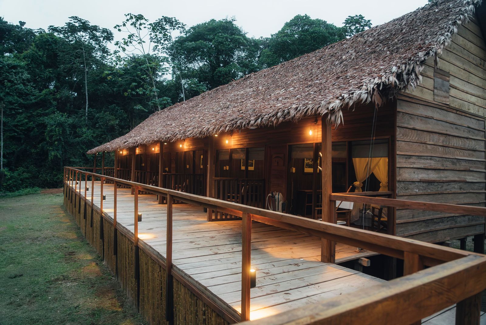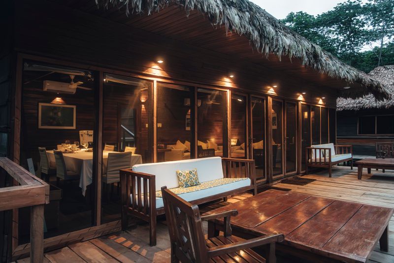 The main lodge hosts meals and cocktails, while modern amenities include generator-backed power, hot water on demand, and Wi-Fi. Argentine chefs create a variety of regional and classic dishes, paired with fine Argentine wines. It is jungle camping with a semi-luxury feel.